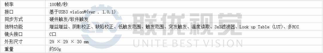 ●XCU-CG160(黑白)1/2.9英寸USB全局快門(mén),160萬(wàn)像素,分辨率為1456 (H) x 1088 (V)(有效像素),幀速率超過(guò)100fps,支持USB3.0 Vision 1.0.1接口。