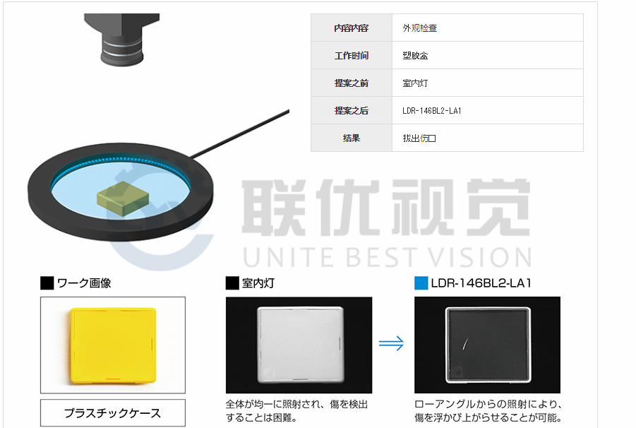 LED垂直地安裝在線形基板上。環形排列的LED彼此水平相對地照明。薄型設計,厚度為10mm。可以盡可能靠近工件使用。