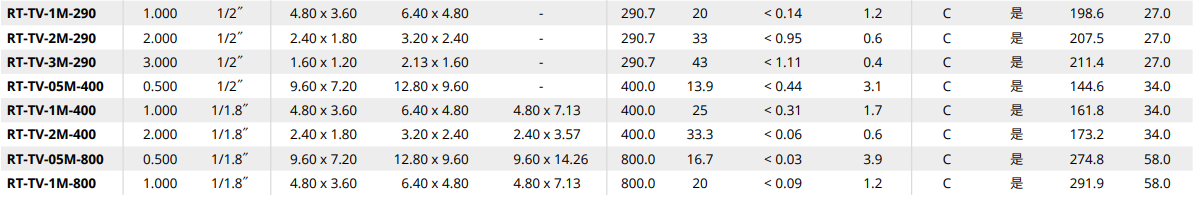 | RT-TV-1M-150 | 1.000 | 8.0 | 1/2″ | 4.80 x 3.60 | 6.40 x 4.80 | - | 156.0 | 16.7 | < 0.24 | 1.0 | C | Yes | 155.6 | 24.0 |