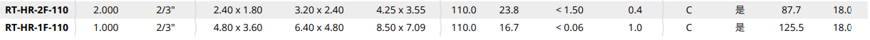 | RT-HR-6F-110 | 6.000 | 11.0 | 2/3″ | 0.80 x 0.60 | 1.07 x 0.80 | 1.42 x 1.18 | 110.0 | 55.6 | < 0.48 | 0.2 | C | Yes | 114.5 | 18.0 |